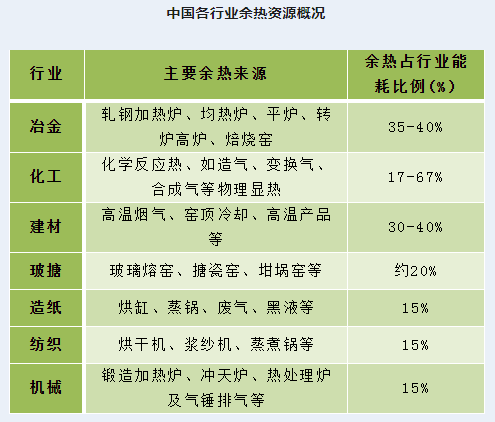 目前,我国钢铁、有色、化工、水泥、建材、石油与石化、轻工、煤炭等行业的余热总资源情况如下: